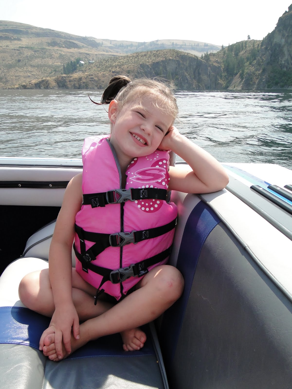 We left Enumclaw Thursday morning and headed to Lake Roosevelt for a four day camping weekend. The kids were beside themselves with excitement. I was a little nervous on how it was going to be with a 21 month old, camping?!?!??! She did horrible the first night, didn't sleep until 11:00. The next day she didn't nap her usually nap, but got enough to help her be a little less grumpy. She learned the word boat and water on our trip. She loved playing in the sand and going in and out of the tent. The older two, did amazing. They loved every minute of it. Our friends brought their boat and we were able to watch our kids go on the tube and knee board. James and Abbie were pros on the board, James tells us he is going to work on his 360 next year. Here are a few shots we got of the kids participating in boating activities.